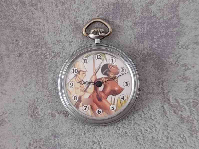 Historické kapesní hodinky s erotickym motivem "na lovu".