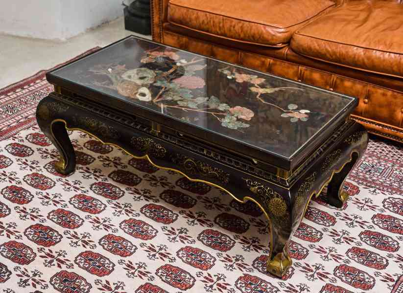 Výjimečný starožitný nízký stolek pocházející z Číny, zhotovený z masivního exotického dřeva a opatřený hlubokým černým lakem se zlacenými ornamenty. Horní deska je bohatě ručně malovaná a vykládaná ručně řezanými kameny, pravděpodobně jadeitem a dalšími polodrahokamy, s jemným květinovým motivem v tradiční čínské symbolice.